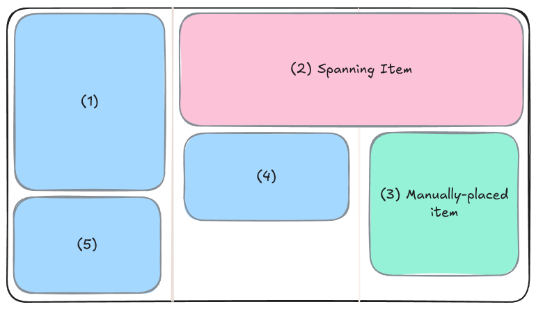 Note: This algorithm ensures that each track is at least big enough to accommodate every item that is ultimately placed in it, and does not create dependency cycles between placement and track sizing. However, depending on the variation in sizes, tracks could be larger than necessary: an exact fit is only guaranteed if all items are explicitly placed in the grid axis or all items are the same size (or matching multiples of that size, in the case of spanning items).