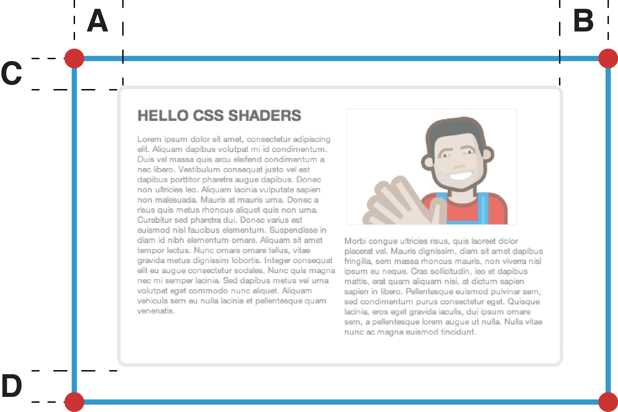 In addition, CSS shaders bring the ability to transform the geometry of document elements in an arbitrary way by allowing vertex shaders to apply to the elements's box (generated box in HTML, object bounding box in SVG).