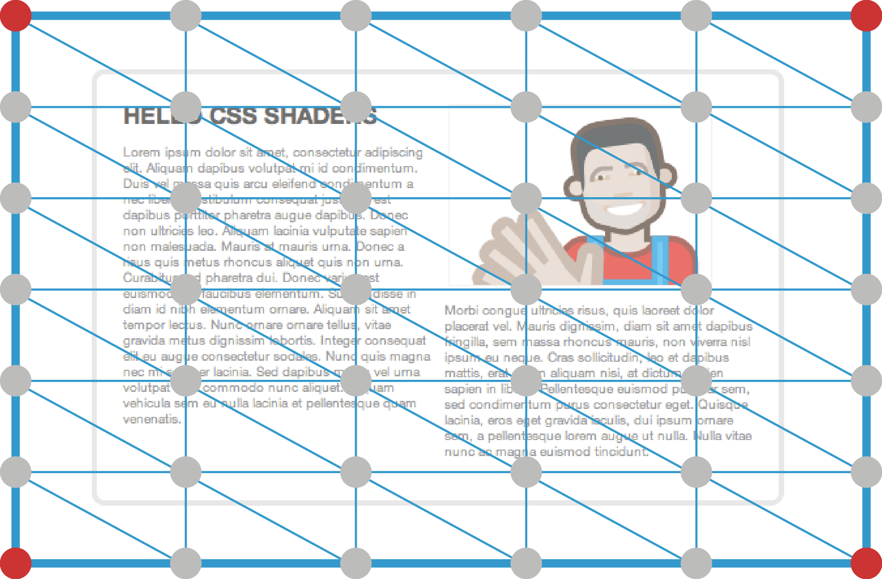 When applied to document content such as HTML or SVG elements, shaders can be used in very interesting ways. These 2D elements can conceptually be drawn on a mesh of vertices that can then be processed through a vertex shader for distortion and then to a fragment shader for pixel processing.